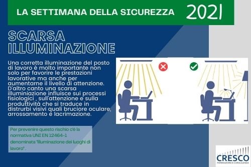 Una corretta illuminazione del posto di lavoro è molto importante non solo per favorire le prestazioni lavorative ma anche per aumentare il livello di attenzione. D’altro canto una scarsa illuminazione influisce sui processi fisiologici, sull’attenzione e sulla produttività che si traduce in disturbi visivi quali bruciore oculare, arrossamento e lacrimazione. Per prevenire questo rischio c’è la normativa UNI EN 12464-1 denominata “illuminazione dei luoghi di lavoro”. La norma specifica i requisiti di illuminazione per persone, in posti di lavoro in interni, che corrispondono alle esigenze di comfort visivo e di prestazione visiva di persone aventi normale capacita’ oftalmica (visiva)